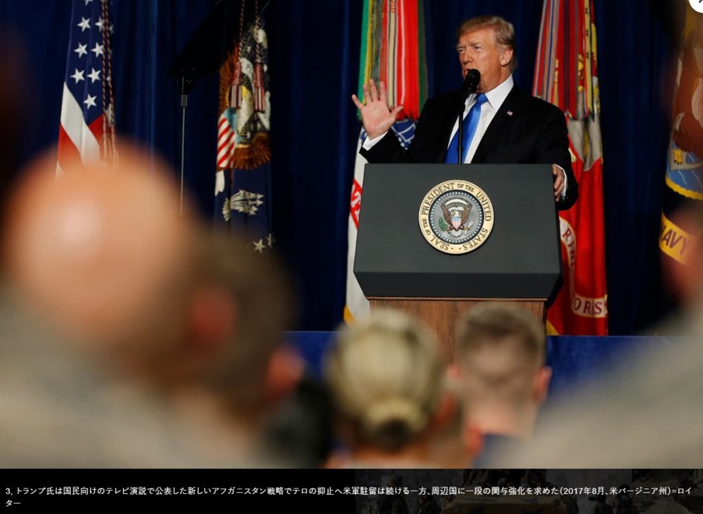 3, トランプ氏は国民向けのテレビ演説で公表した新しいアフガニスタン戦略でテロの抑止へ米軍駐留は続ける一方、周辺国に一段の関与強化を求めた(2017年8月、米バージニア州)=ロイター