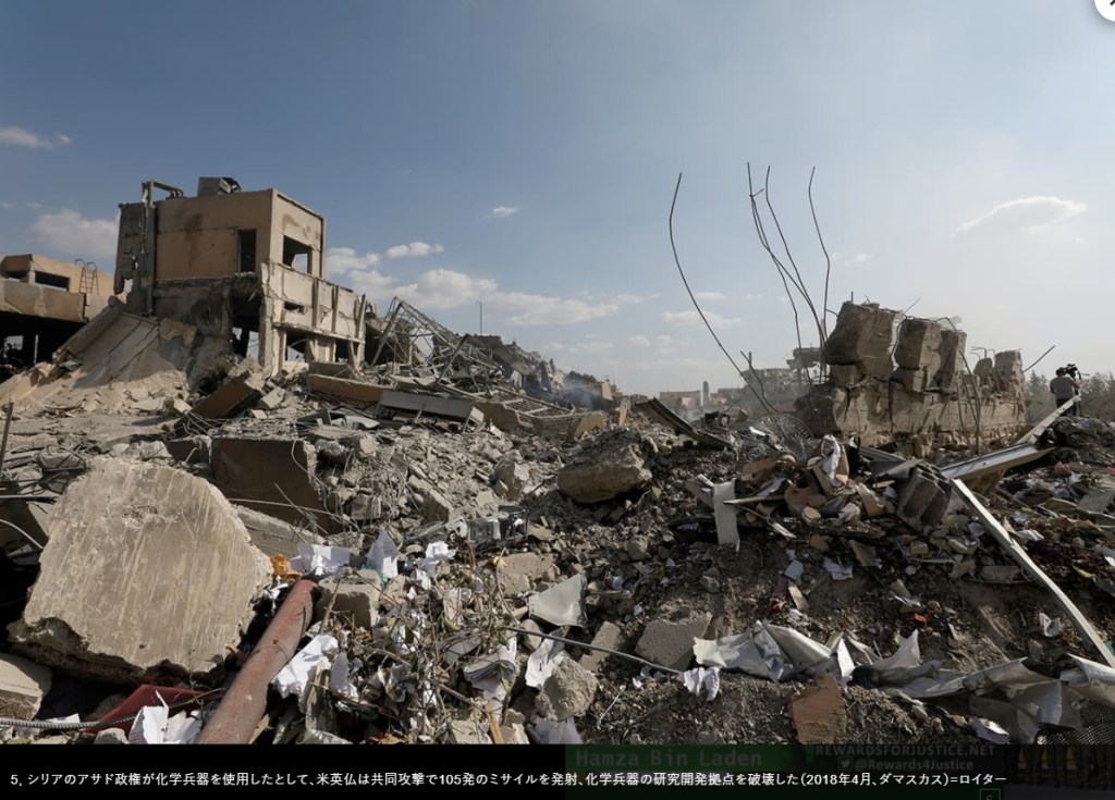 5, シリアのアサド政権が化学兵器を使用したとして、米英仏は共同攻撃で105発のミサイルを発射、化学兵器の研究開発拠点を破壊した(2018年4月、ダマスカス)=ロイター
