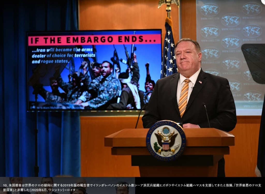 10, 米国務省は世界のテロの動向に関する2019年版の報告書でイランがレバノンのイスラム教シーア派民兵組織ヒズボラやイスラム組織ハマスを支援してきたと指摘、「世界最悪のテロ支援国家」と非難した(2020年6月、ワシントン)=ロイター 』