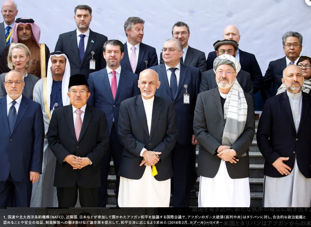 『1, 国連や北大西洋条約機構(NATO)、近隣国、日本などが参加して開かれたアフガン和平を協議する国際会議で、アフガンのガニ大統領(前列中央)はタリバンに対し、合法的な政治組織と認めることや安全の保証、制裁解除への働き掛けなど譲歩策を提示して、和平交渉に応じるよう求めた(2018年2月、カブール)=ロイター