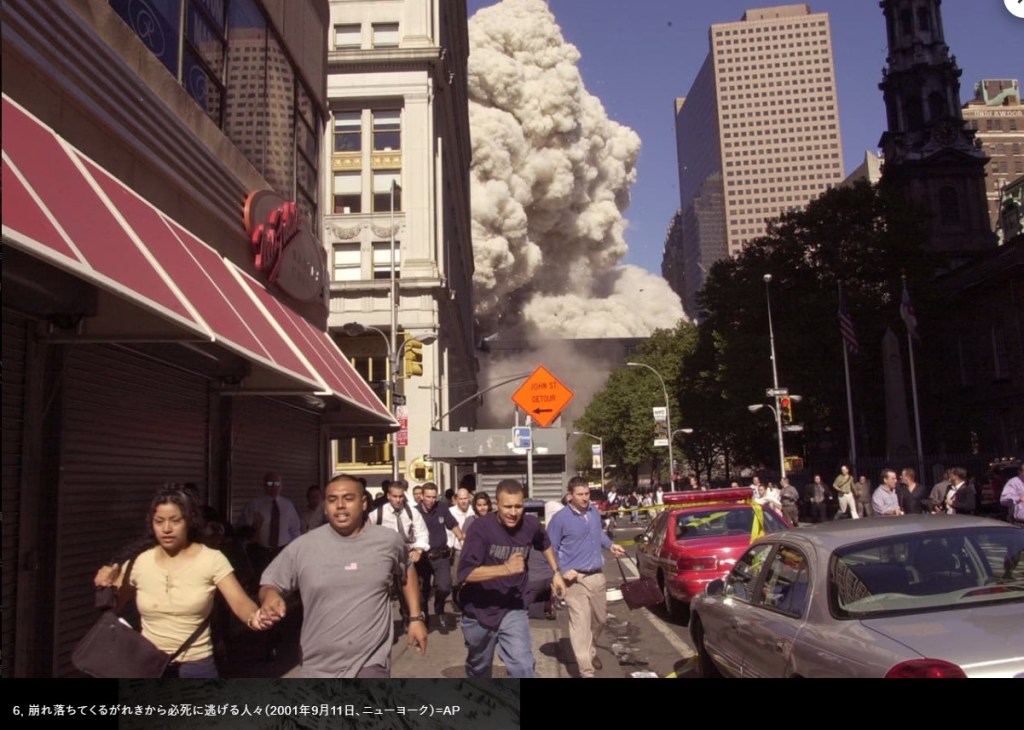 6, 崩れ落ちてくるがれきから必死に逃げる人々(2001年9月11日、ニューヨーク)=AP