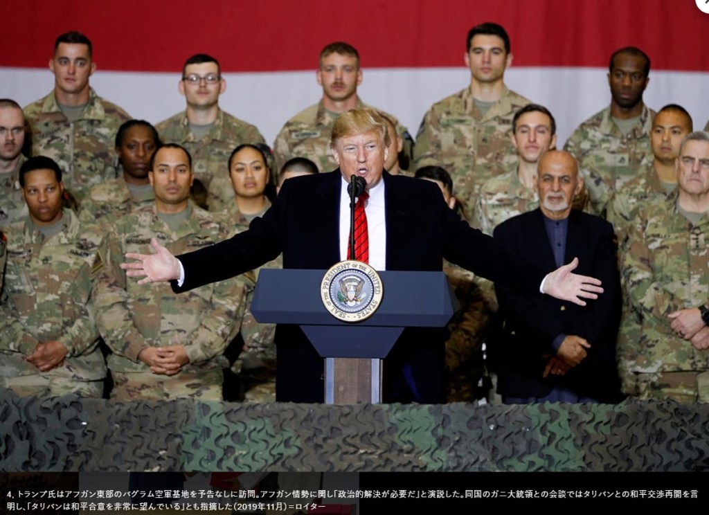 4, トランプ氏はアフガン東部のバグラム空軍基地を予告なしに訪問。アフガン情勢に関し「政治的解決が必要だ」と演説した。同国のガニ大統領との会談ではタリバンとの和平交渉再開を言明し、「タリバンは和平合意を非常に望んでいる」とも指摘した(2019年11月)=ロイター
