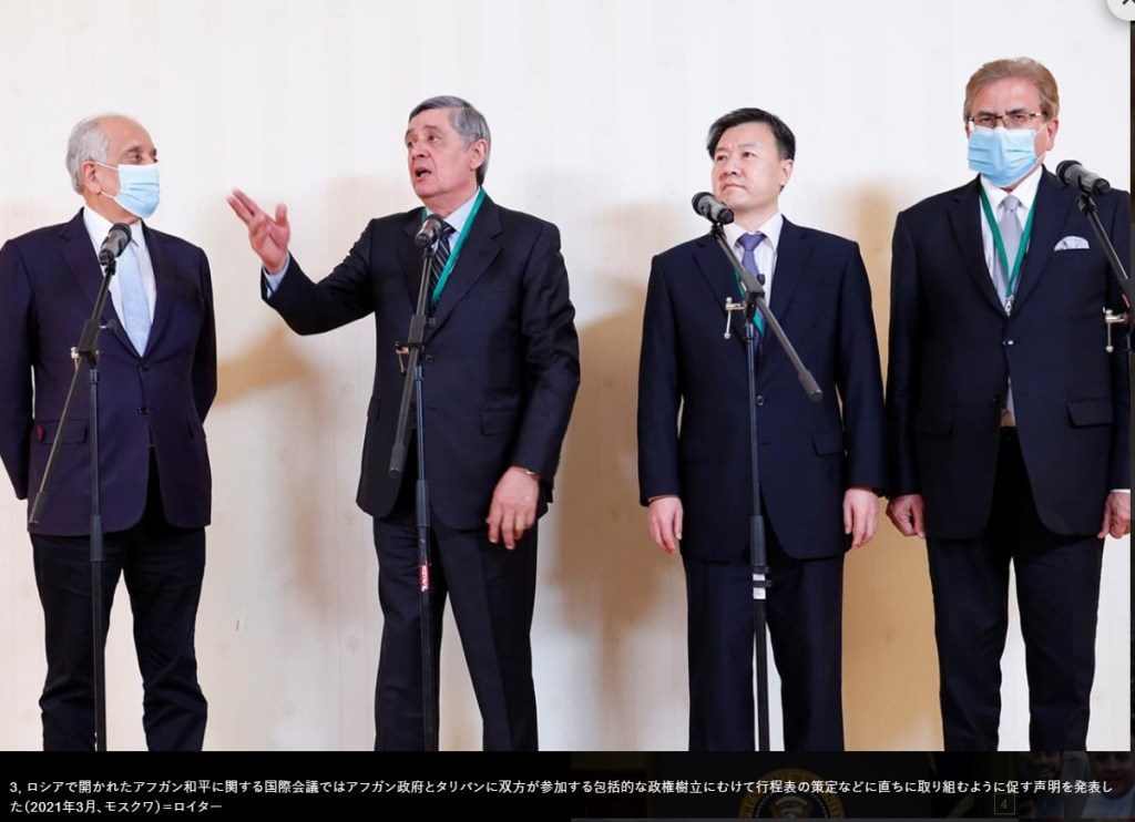 3, ロシアで開かれたアフガン和平に関する国際会議ではアフガン政府とタリバンに双方が参加する包括的な政権樹立にむけて行程表の策定などに直ちに取り組むように促す声明を発表した(2021年3月、モスクワ)=ロイター