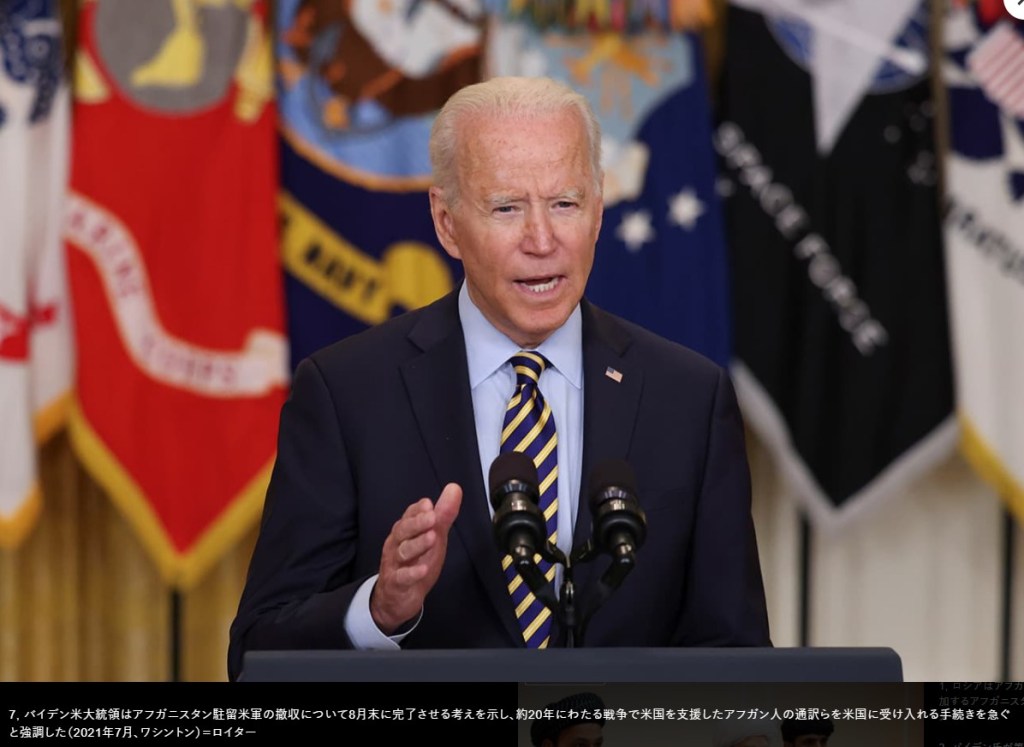 7, バイデン米大統領はアフガニスタン駐留米軍の撤収について8月末に完了させる考えを示し、約20年にわたる戦争で米国を支援したアフガン人の通訳らを米国に受け入れる手続きを急ぐと強調した(2021年7月、ワシントン)=ロイター