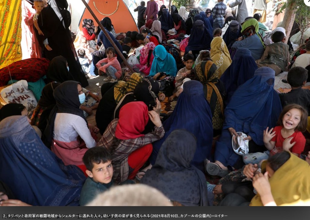 2, タリバンと政府軍の戦闘地域からシェルターに逃れた人々。幼い子供の姿が多く見られる(2021年8月10日、カブールの公園内)=ロイター
