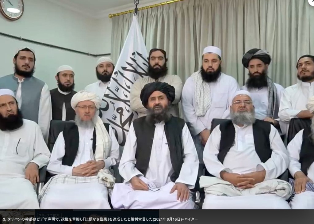 3, タリバンの幹部はビデオ声明で、政権を掌握し「比類なき偉業」を達成したと勝利宣言した(2021年8月16日)=ロイター