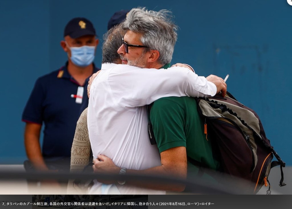 7, タリバンのカブール制圧後、各国の外交官ら関係者は退避を急いだ。イタリアに帰国し、抱き合う人々(2021年8月16日、ローマ)=ロイター