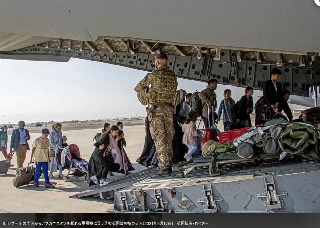 8, カブールの空港からアフガニスタンを離れる軍用機に乗り込む英国籍を持つ人々(2021年8月17日)=英国防省・ロイター