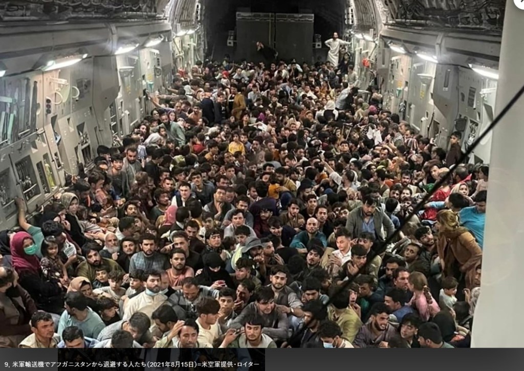 9, 米軍輸送機でアフガニスタンから退避する人たち(2021年8月15日)=米空軍提供・ロイター