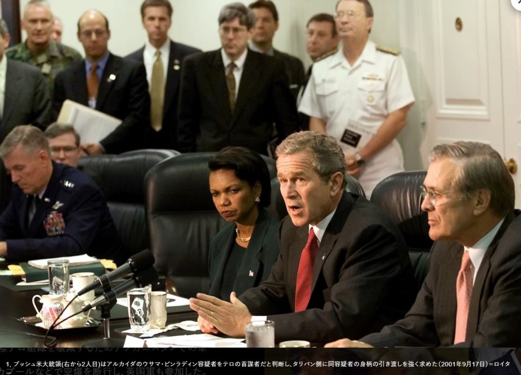 『1, ブッシュ米大統領(右から2人目)はアルカイダのウサマ・ビンラディン容疑者をテロの首謀者だと判断し、タリバン側に同容疑者の身柄の引き渡しを強く求めた(2001年9月17日)=ロイター