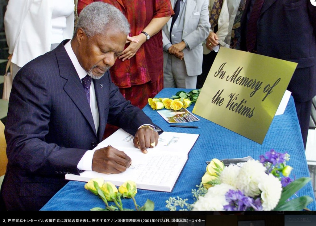 3, 世界貿易センタービルの犠牲者に哀悼の意を表し、署名するアナン国連事務総長(2001年9月24日、国連本部)=ロイター