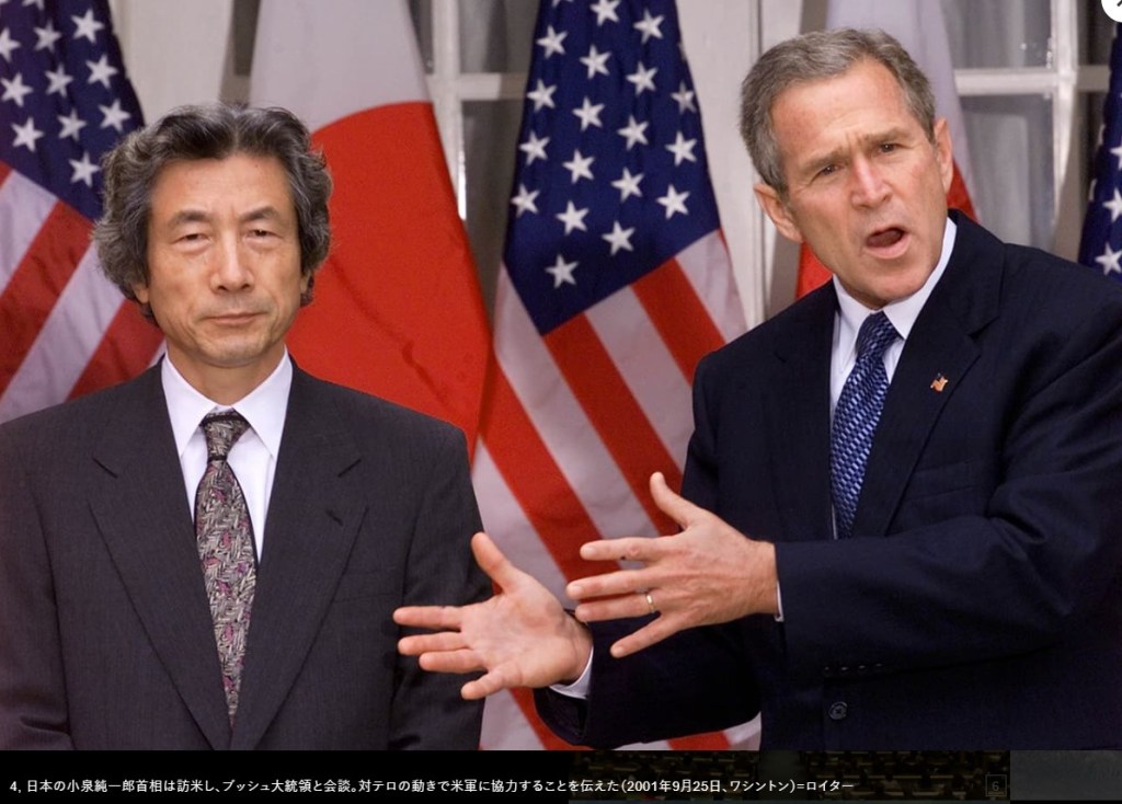 4, 日本の小泉純一郎首相は訪米し、ブッシュ大統領と会談。対テロの動きで米軍に協力することを伝えた(2001年9月25日、ワシントン)=ロイター