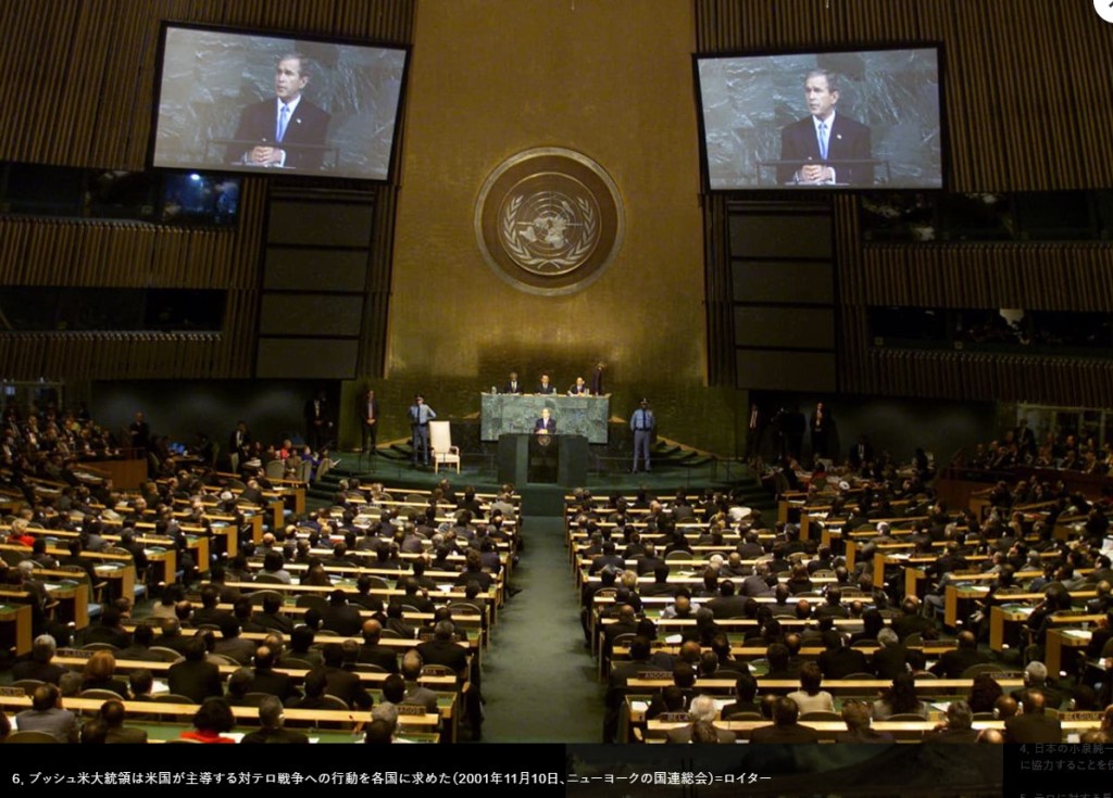 国連安全保障理事会は翌日の2001年9月12日、テロについて「国際平和と安全に対する挑戦」とし、「最も強く非難する」との決議を全会一致で採択した。当時のブッシュ米政権がテロへの徹底抗戦を宣言し、主要国に結束を呼び掛ける外交攻勢に動き始めた。国際社会は一気に「対テロ戦争」へ突き進んだ。