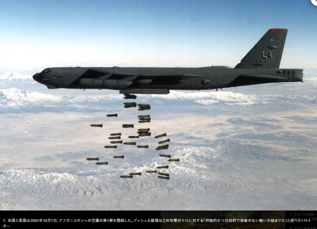 7, 米国と英国は2001年10月7日、アフガニスタンへの空爆の第1弾を開始した。ブッシュ大統領はこの攻撃がテロに対する「持続的かつ包括的で容赦のない戦いの始まりだ」と述べた=ロイター