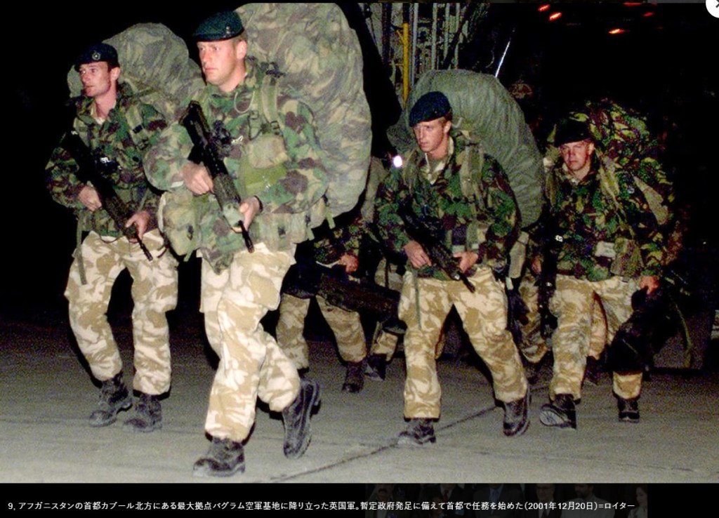 米軍は同年10月、国際テロ組織を壊滅するためアフガニスタンでの軍事行動を開始。首都カブールなどで空爆を断行し、英国軍も参加した。11月にはカブールを制圧、国土の大半を支配してきたタリバンの支配地域は一気に縮小した。12月にはアフガン暫定行政機構が発足した。』
