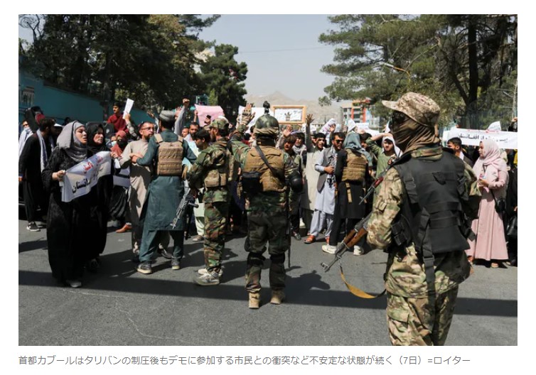 首都カブールはタリバンの制圧後もデモに参加する市民との衝突など不安定な状態が続く(7日)=ロイター
