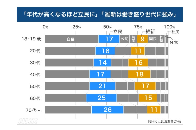 NHKの出口調査では、若者が自民党を支持する傾向がはっきりと読み取れた。