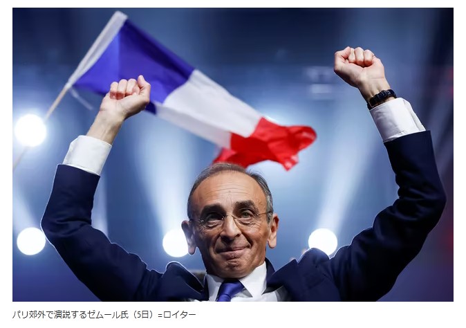 「私は人種差別主義者ではないし、みなさんも違う。ただフランスを守ろうとしているだけだ」。ゼムール氏は5日、パリ郊外の支援者集会で声を張り上げた。背後には選挙スローガンのナポレオンの言葉「IMPOSSIBLE N’EST PAS FRANCAIS(余の辞書に不可能の文字はない)」のパネルが掲げられている。主催者発表では約1万3千人が参加し、フランスの三色旗を持ち熱狂的に支持を表明した。