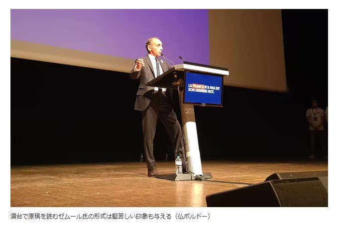 これが支持を支えるもう一つの要素だ。誇り高き自国の歴史を知っているとの印象を与え、自らをナポレオンや戦中・戦後に指導力を発揮したシャルル・ドゴール将軍などと重ね合わせる。フランスの地位が下がっていると不満を持つ極右の知識層を取り込むのが狙いだ。会場に来た名門ボルドー政治学院の学生アドリアンさん(18)は「フランスはイスラム教との内戦状態にあると思う」と語り、ゼムール氏の持論に同調した。女性会社員(23)は「彼は歴史をよく知っている。この知性に引かれる」とほれぼれした様子だった。支援者は同氏は歴史家と考えるが、誤りや曲解が多いと指摘される。