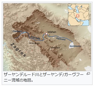 ザーヤンデルード川の流域は、41,500平方キロメートル (16,000 sq mi)、標高は3,974メートル (13,038 ft)から1,466メートル (4,810 ft)の範囲であり、年平均の降水量は130ミリメートル (5 in)、月平均気温は3 °C (37 °F)から29 °C (84 °F)の間で変動する。流域には、2,700平方キロメートル (1,000 sq mi)の灌漑地が広がっており、ザーヤンデルード川に9か所設けられたおもだった利水施設や、横方向から川に向かう谷筋にある井戸、カナート、湧水などから水を得ている。ザーヤンデルード川の水は、イラン中央部、特にエスファハーンやヤズド一帯の住民たちの生活を支えている。渇水が起こる前、人口一人あたり1日あたりの供給水量は、都市部で240リットル(63米ガロン/53英ガロン)、農村部で150リットル(44米ガロン/33英ガロン)であった[5]。1970年代には、年間1.2立方キロメートル (0.3 cu mi)、1秒あたり38立方メートル (1,340 cu ft)と見積もられていた[6]。 』