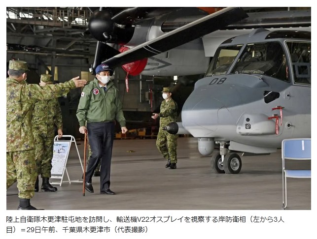 『岸信夫防衛相は29日、陸上自衛隊木更津駐屯地(千葉県木更津市)を訪れ、暫定配備されている輸送機V22オスプレイの本格運用に向けた準備状況を視察した。オスプレイに自ら搭乗。自衛隊のオスプレイに防衛相が搭乗したのは岸氏が初めて。米軍のオスプレイには2016年に当時の稲田朋美防衛相が試乗した例がある。