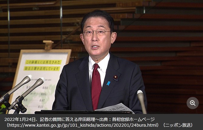岸田総理「株主資本主義からの転換へ」と発言2022年1月24日、記者の質問に答える岸田総理~出典:首相官邸ホームページ(https://www.kantei.go.jp/jp/101_kishida/actions/202201/24bura.html)