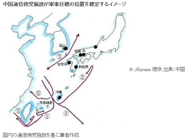 中国通信傍受施設が軍事目標の位置を標定するイメージ