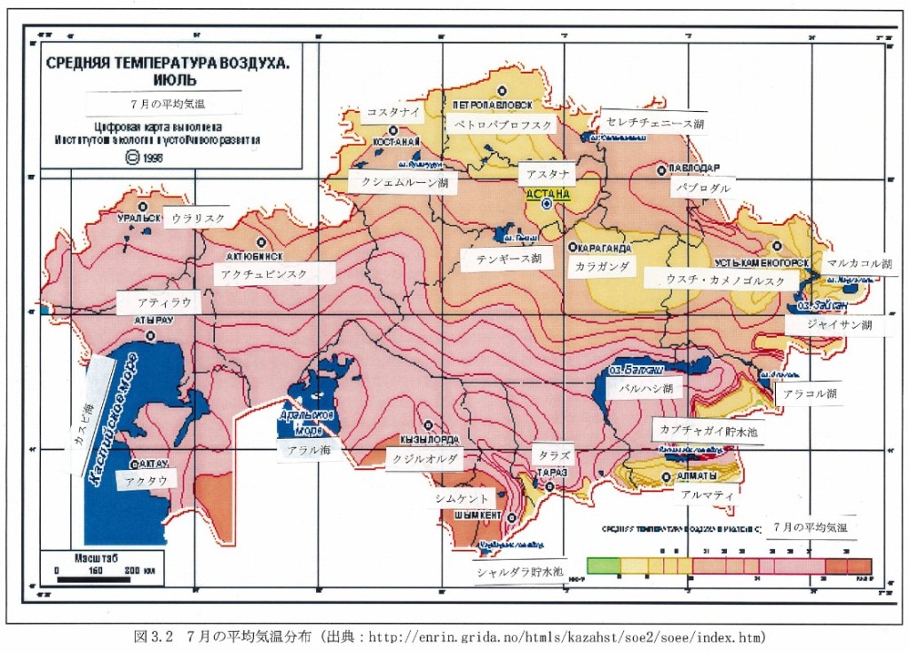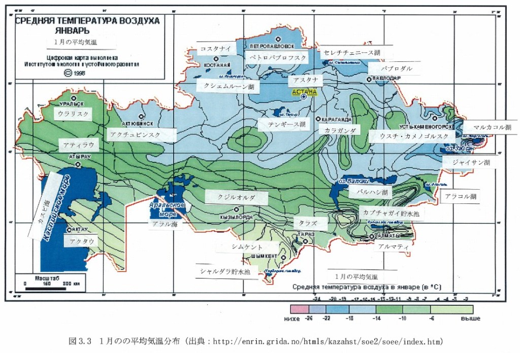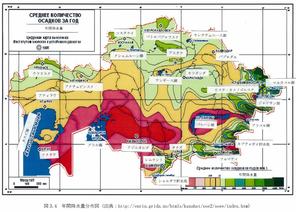 中央アジアの気象はスケールが大きい。カザフスタンの南には7,000m級の天山山脈とパミール高原が連なる。インドの南から吹いてくるモンスーンの雨は8,000m級のヒマラヤ山脈とその西に連なるヒンドゥークシュ山脈に完全にシャットアウトされて、これより北には雨は降らない。カザフスタンの降水は、遙か北極や大西洋からもたらされ、北風が天山山脈に当たって雪となる。天山山脈より南はこの水分もシャットアウトされ、広大なタクラマカン砂漠となる。日本列島は3,000m級の山しかないが、それでも冬は、関東地方はカラカラになる。この倍以上の高さの山が連なるので、中央アジアではさらに徹底的に水分が搾り取られる。