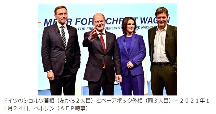 『【ベルリン時事】昨年12月に発足したドイツの社会民主党(SPD)、緑の党、自由民主党(FDP)の3党による新連立政権は、民主主義や人権など西欧の「価値に基づく外交」を新機軸に掲げる。ベーアボック外相はじめ緑の党所属の政治家の「理想主義」を指摘する声がある一方、中国やロシアに対抗する現実的な戦略との評価もある。ドイツは今年、先進7カ国(G7)の議長国を務める。こうした新政権の外交の真価が問われる機会も多くなりそうだ。