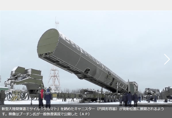 ロシアのプーチン大統領が1日、年次教書演説を行い、開発中の「驚異の新兵器群」を発表した。新型大陸間弾道ミサイル「サルマト」や、原子力エンジンで射程距離が無制限のステルス巡航ミサイルなどだ。だが米の専門家らの間には「使い古された技術」と一蹴する向きも。実際には新兵器というより、「より危険な兵器」との懸念が浮かび上がる。(岡田敏彦)