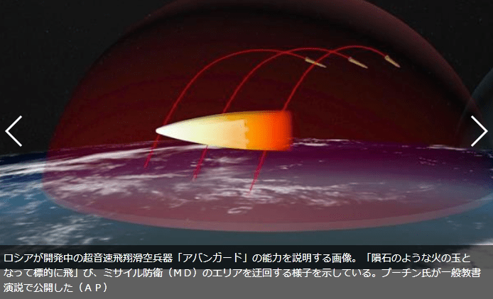 大気圏突入後、滑空して目標へのコースを変える超音速飛翔滑空兵器「アバンガード」も搭載できるという。アバンガードは機体表面が約2000度近くになり「隕石のような火の玉となって標的に飛ぶ」。』