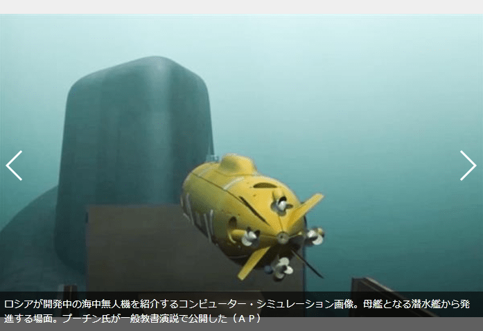 4つめは海中無人機だが、動力は核エンジンで、長射程を獲得するためとみられる。潜水艦から発射され、通常の潜水艦では潜れないような深海を航行する。しかもスピードは潜水艦より速く、目標艦船に回避の時間を与えない。また核弾頭を搭載すれば港湾など陸上施設の攻撃も可能という。