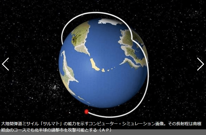 最も脅威的なのは、大陸間弾道ミサイル「RS28サルマト」で、射程は11万キロ。 通常の攻撃コースである北極経由はもちろん、南極経由でも欧米を攻撃できる射程を持ち、弾頭重量は100トン、核弾頭なら15個を搭載できるという。