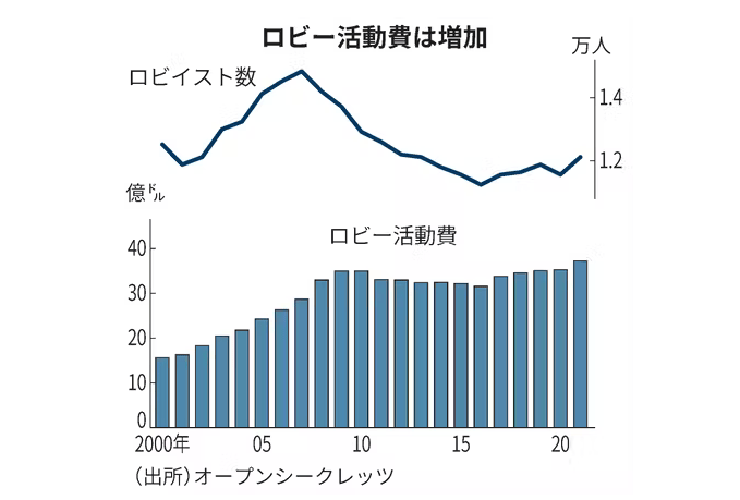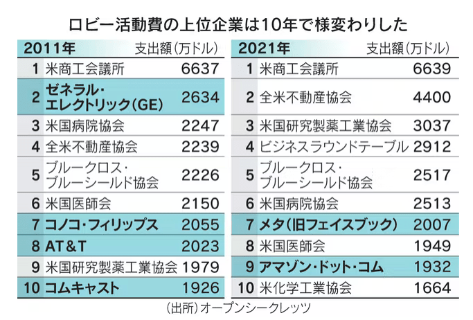 ロビー活動は企業の趨勢と産業政策の焦点を映す。かつてはゼネラル・エレクトリックやボーイング、エクソンモービルなどの製造・防衛大手や石油企業が中心を担った。西海岸のIT勢は政治と距離を置いてきたが、ここ数年、首都ワシントンでの存在感は急速に高まっている。米国のロビー活動費は2021年に20年比6%増の37億3000万ドル(約4700億円)と過去最高。支出額上位には米商工会議所などの業界団体に続き、メタやアマゾン・ドット・コムが挙がる。