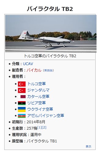 バイラクタル TB2https://ja.wikipedia.org/wiki/%E3%83%90%E3%82%A4%E3%83%A9%E3%82%AF%E3%82%BF%E3%83%AB_TB2