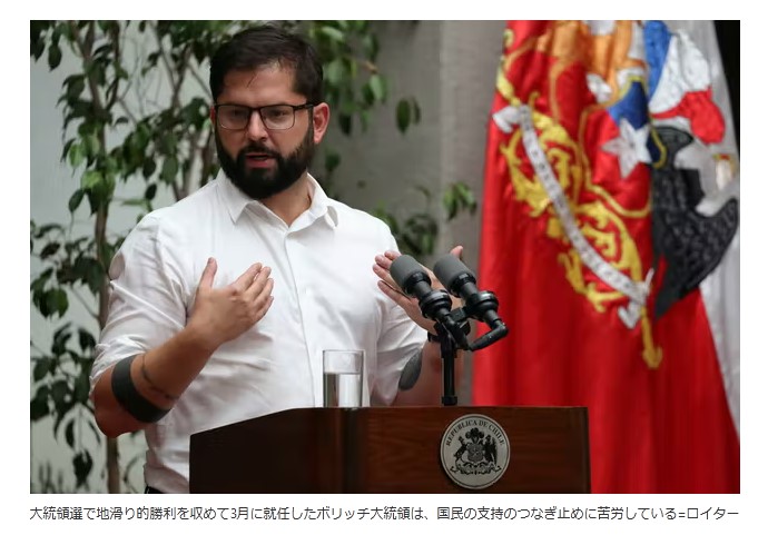 『チリの1990年の民政移管後では最も若いボリッチ大統領の支持率が急落している。新型コロナウイルスのパンデミック(世界的大流行)への対応として導入された景気刺激策の終了が新政権への不満を高め、有権者との蜜月は唐突に終わった。
