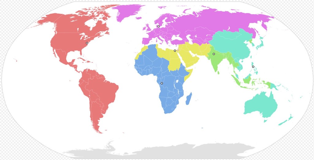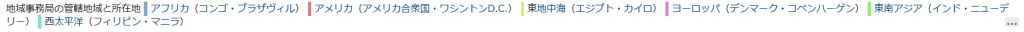 右の図のように、世界にアフリカ・アメリカ・東地中海・ヨーロッパ・東南アジア・西太平洋の6つの地域事務局が置かれ、それぞれに管轄地域が与えられている。また重点区域とされている150か国[16]には国事務所が設置されている[17]。