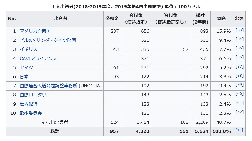また、ビル&メリンダ・ゲイツ財団やGAVIアライアンス、国際連合人道問題調整事務所、国際ロータリー、世界銀行といった各種団体の寄付金拠出が大きく、国家の占める割合が相対的に少ないことも特徴である。