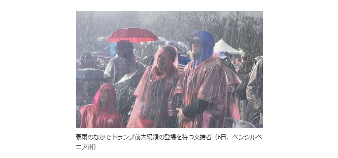 豪雨のなかでトランプ前大統領の登場を待つ支持者(6日、ペンシルベニア州)