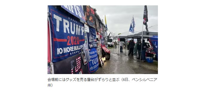 「この雨だ。バイデン大統領の集会だったら誰も来ないよ」。地元でイベントプロモーターをしているデビッド・ストーニー氏(63)は笑みを浮かべた。足元はぬかるみ、靴はドロドロ。それでも会場になった郊外の公園には続々と支援者の車がやってくる。