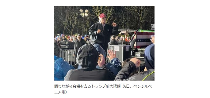 踊りながら会場を去るトランプ前大統領(6日、ペンシルベニア州)