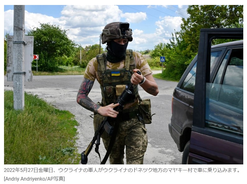 2022年5月27日金曜日、ウクライナの軍人がウクライナのドネツク地方のマヤキー村で車に乗り込みます。[Andriy Andriyenko/AP写真]