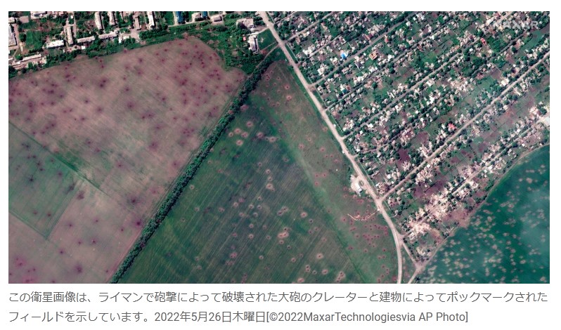 この衛星画像は、ライマンで砲撃によって破壊された大砲のクレーターと建物によってポックマークされたフィールドを示しています。2022年5月26日木曜日[©2022MaxarTechnologiesvia AP Photo]