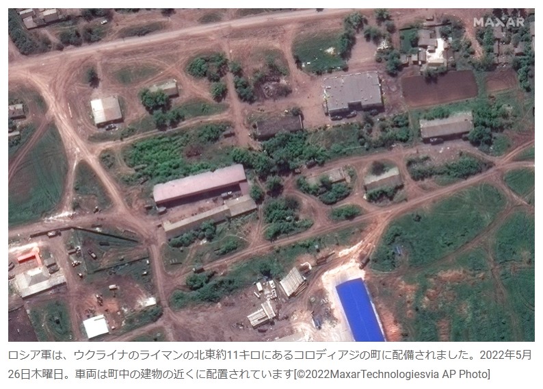 ロシア軍は、ウクライナのライマンの北東約11キロにあるコロディアジの町に配備されました。2022年5月26日木曜日。車両は町中の建物の近くに配置されています[©2022MaxarTechnologiesvia AP Photo]
