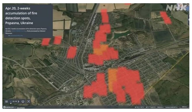 渡邉教授によりますと、人工衛星から赤外線を使って収集したデータをもとに火災の発生状況をみると、東部ルハンシク州のポパスナやルビージュネなどの都市で、ロシア軍の攻撃とみられる火災がこの1か月、相次いで起きていて、攻撃が激化している様子が確認できるということです。