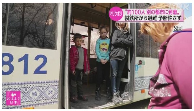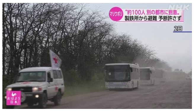 東部 マリウポリのアゾフスターリ製鉄所から市民をザポリージャに避難させるルートにある村で撮影された映像では、赤十字のマークがついた車両に先導されて、市民を乗せたバスが次々と到着しています。