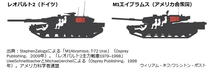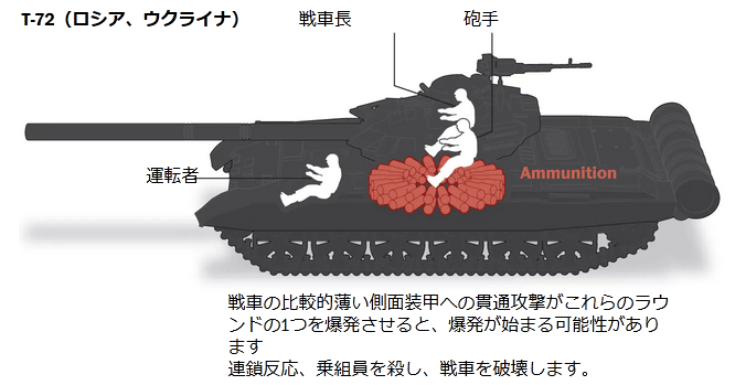 ハミルトン氏によると、ほとんどの西側戦車の弾薬は、砲塔の床の下に置いて、重い船体で保護するか、砲塔の後ろに置くことができます。砲塔に配置された弾薬保管コンパートメントは潜在的に攻撃に対して脆弱ですが、組み込みの機能により、T-72の場合に見られるのと同じレベルの斬首による荒廃を防ぐことができます。