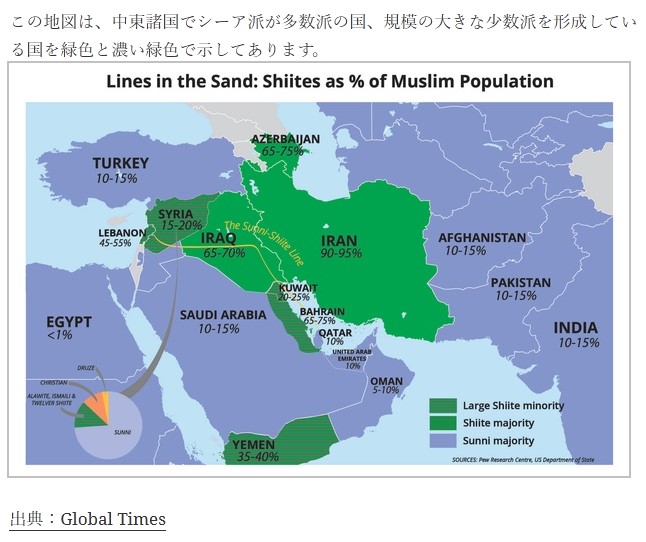シーア派はイスラーム世界全体では少数派ですが、それは人口の多い東南アジアやインドがほとんどスンナ派であるというせいもあります。中東ではスンナとシーア派の人口は全体ではかなり拮抗しており、シーア派は一部の国では多数派になっています。