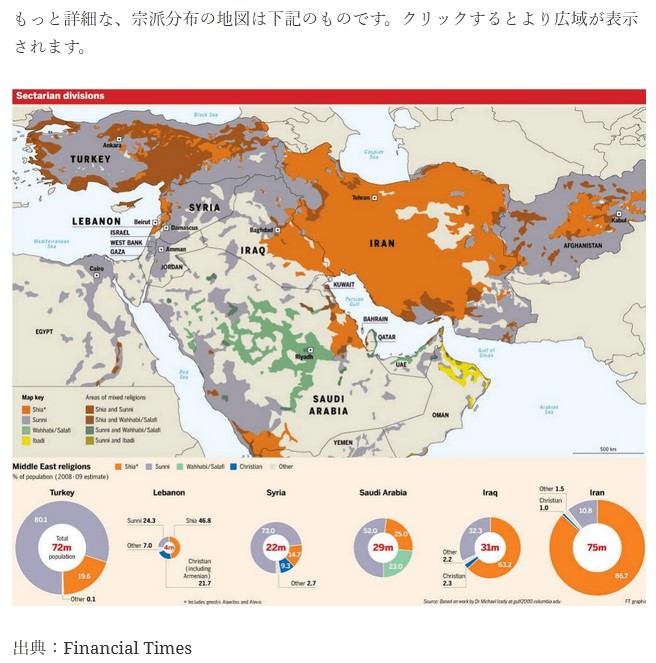 サウジアラビアについて、アラビア半島中央部のネジュド地方、つまりサウジアラビアの王家・支配部族の本拠地についてはワッハーブ派で緑に塗られていて、それに対してエジプトやヨルダンに近い紅海沿岸のヒジャーズ地方は「普通の」スンナ派でパープルグレーに塗り分けられています。このことも今後の展開によっては意味を持ってくるかもしれません。