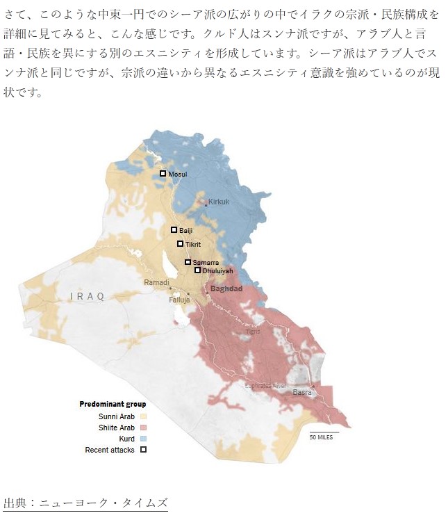 ISISの侵攻は北部から中部にかけてのスンナ派が多数を占める地帯では一気に進んだことがわかります。しかしバグダード以南に浸透するのはかなり難しそうです。またその際は激しい戦闘になり流血の惨事となるでしょう。